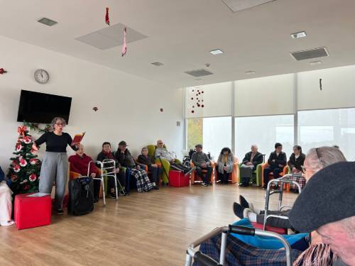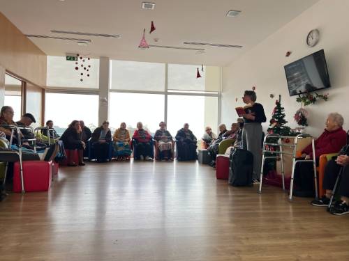 Mais tarde, foi a vez de os utentes do centro de dia receberem a visita da biblioteca. Entre memórias e afetos, ouviram as aventuras e desventuras da Guidinha, uma menina do seu tempo, que escrevia redações escolares cheias de humor. A história contada e as outras partilhadas pelos utentes arrancaram risos e gargalhadas, criando uma atmosfera de cumplicidade e emoção. Para fechar com chave de ouro, todos se juntaram numa cantoria de melodias de Natal, aquecendo corações e reforçando laços.